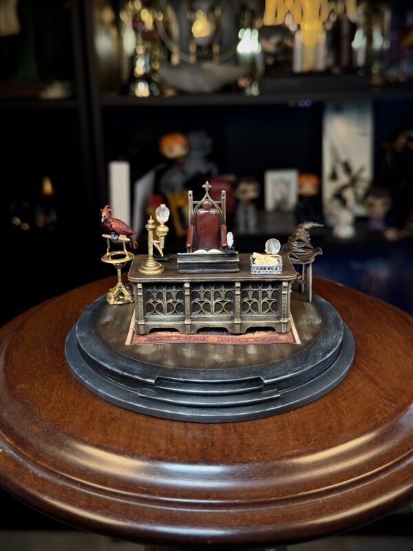 Sí. En Callejón Figurón puedes encontrar una miniatura artesanal en edición limitada que recrea el despacho a escala con más de diez elementos: escritorio gótico, fénix en percha, sombrero seleccionador, bola de cristal, diario con colmillo y mucho más, todo sobre una base oval de madera oscura.