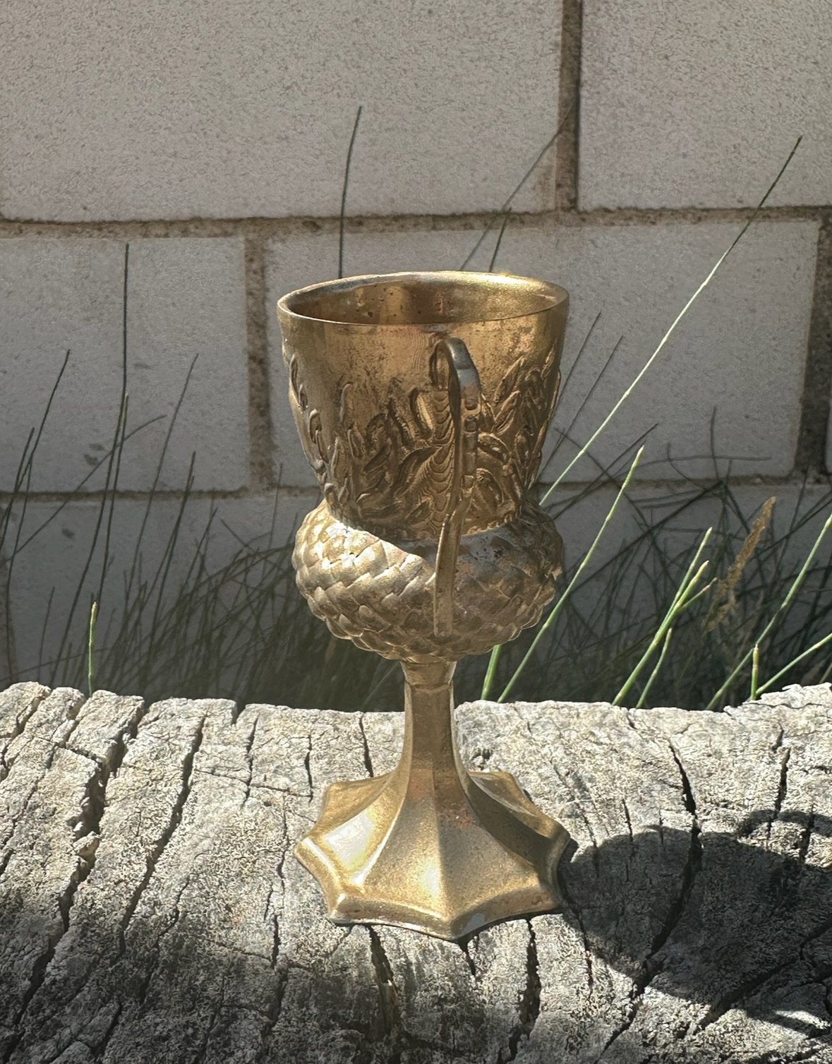 Su diseño combina elegancia y simbolismo, con un cáliz ornamentado en tonos dorados y detalles finos que reflejan el espíritu de la casa: trabajo duro, justicia y humildad.