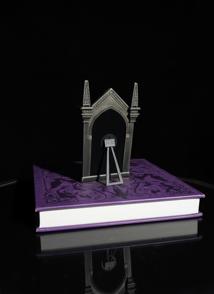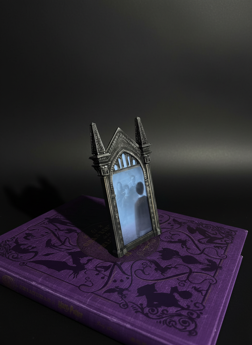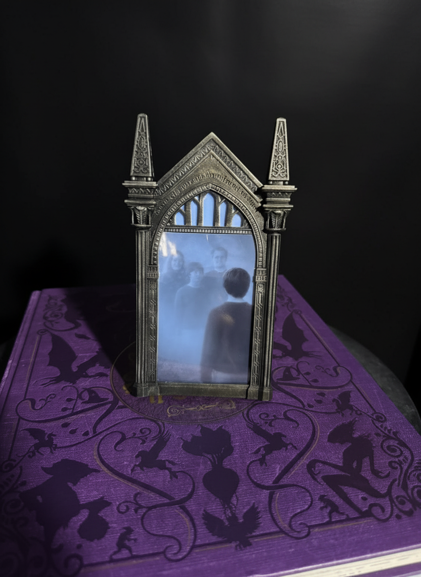 El marco del espejo está ricamente ornamentado, con detalles góticos y símbolos grabados que aportan un aire solemne y misterioso.