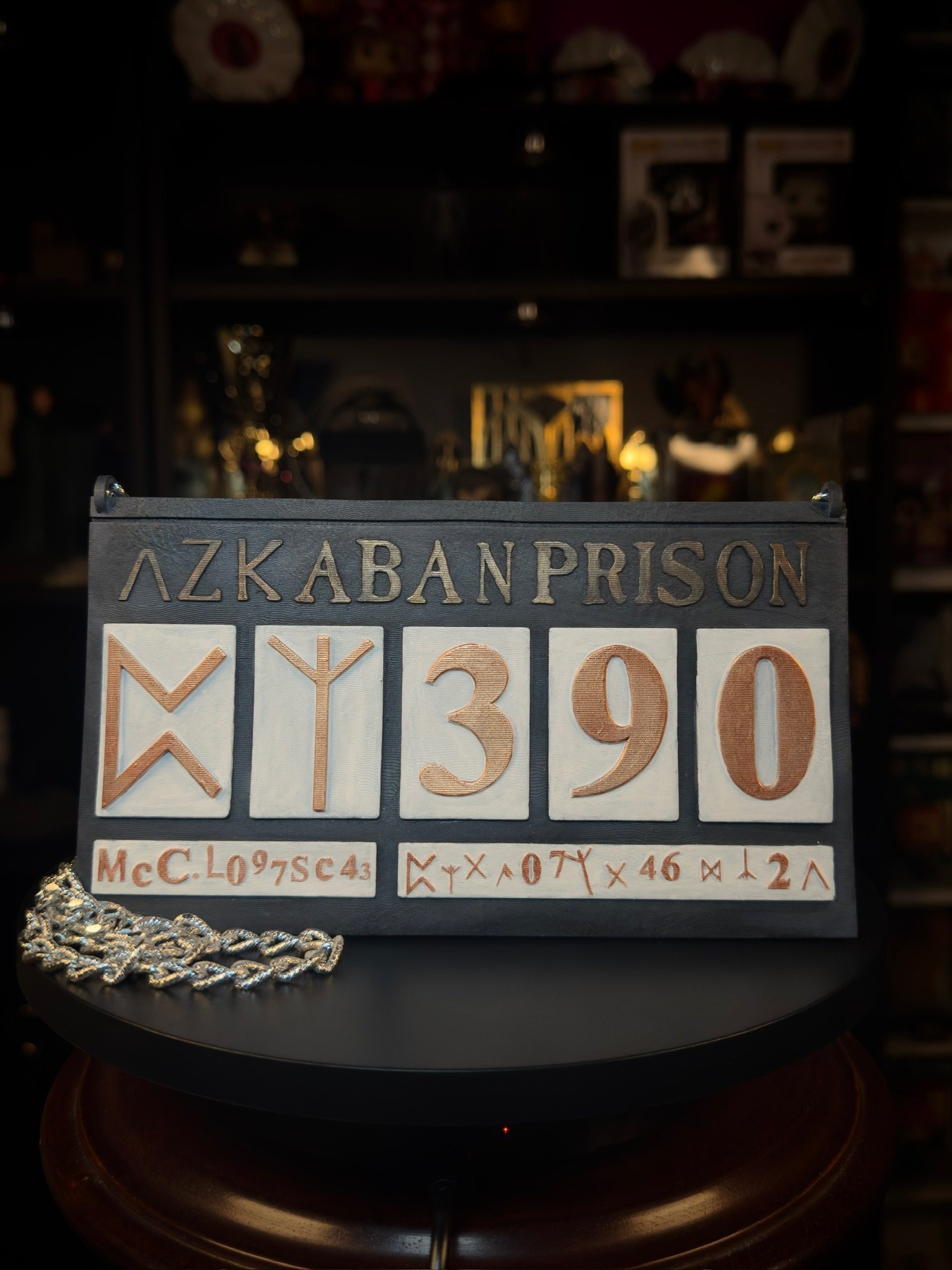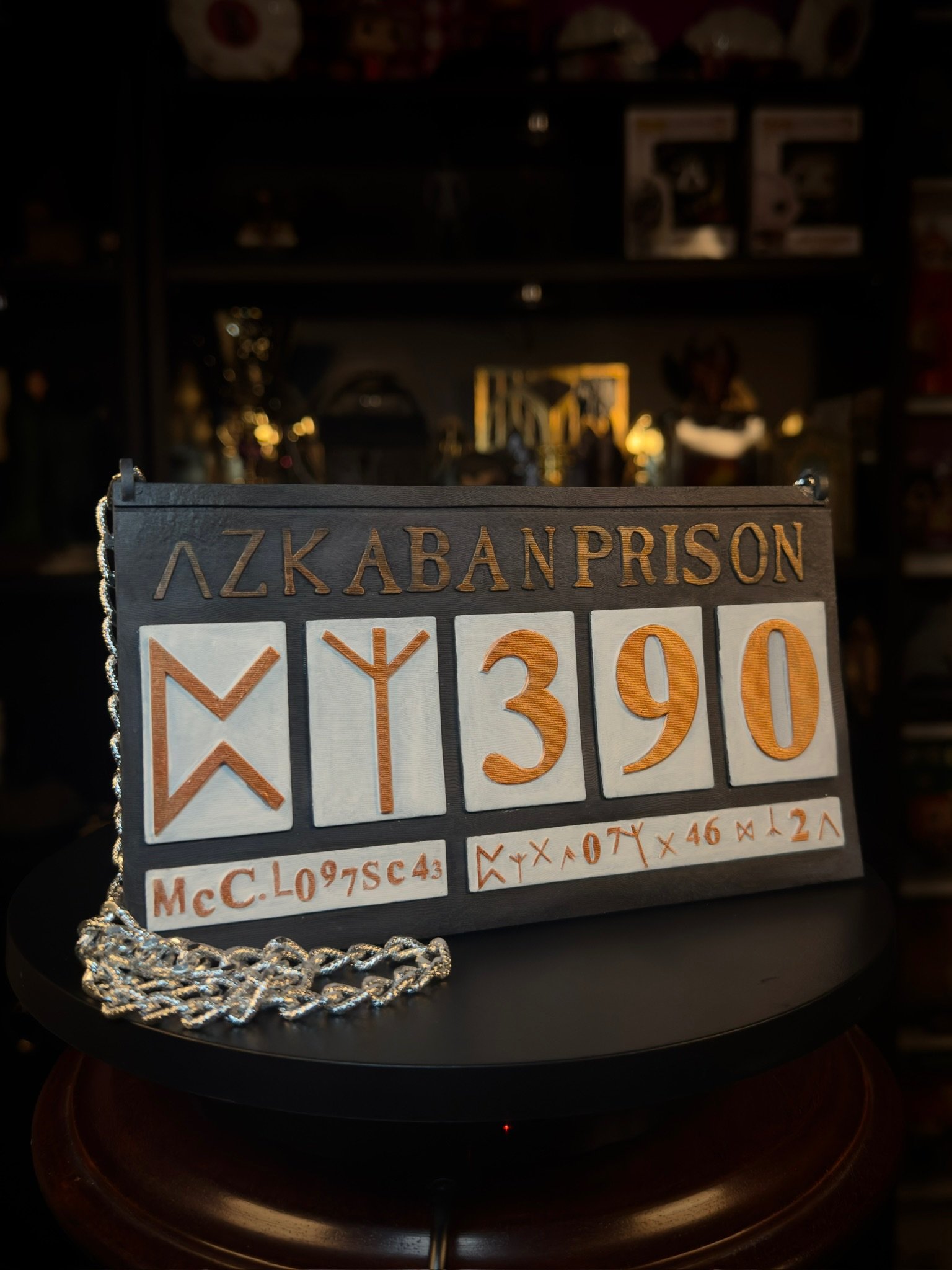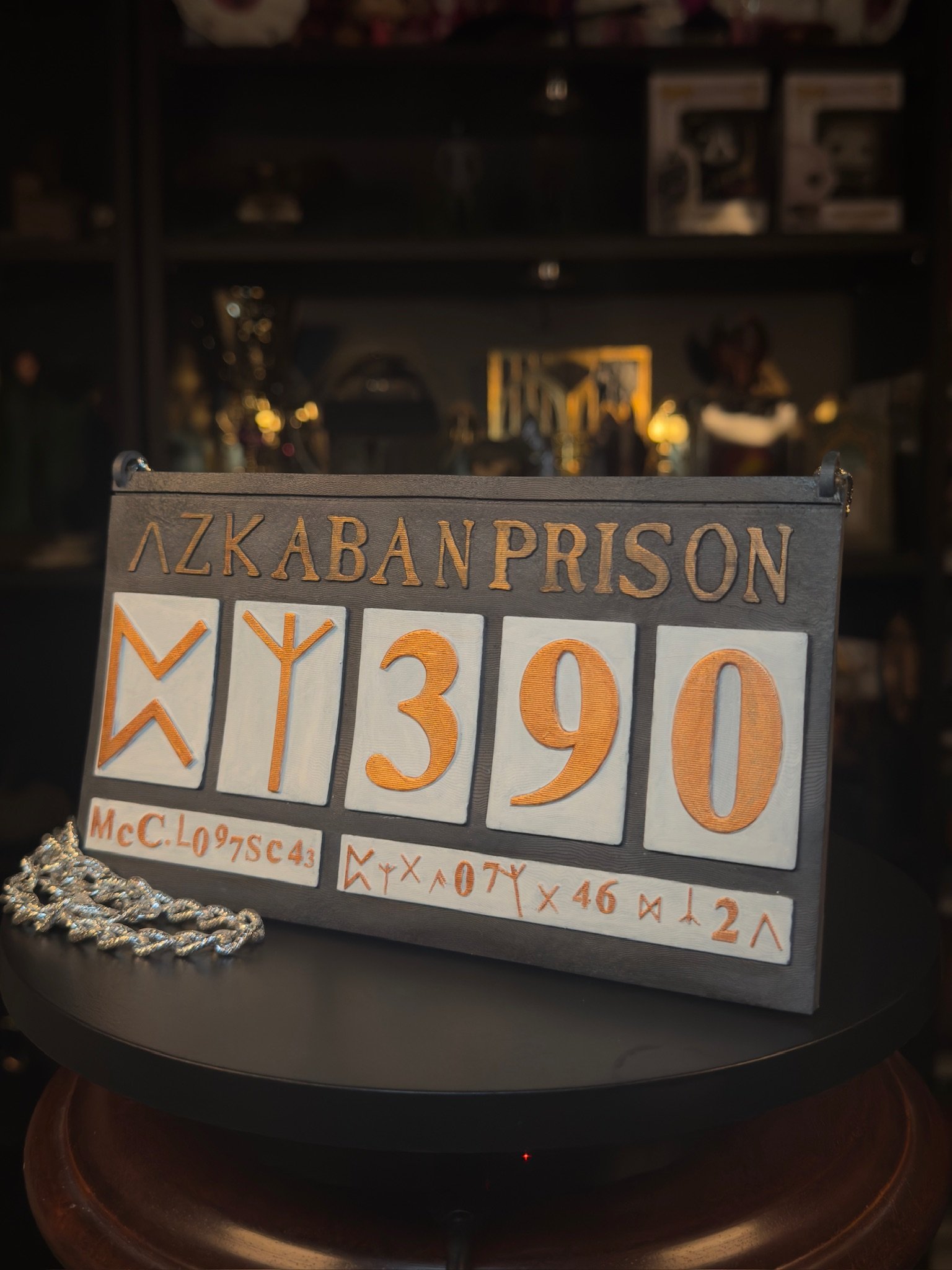 Esta pieza recrea la placa identificativa de un prisionero de una fortaleza oscura, un objeto cargado de historia dentro del mundo mágico.