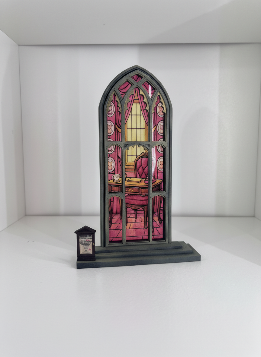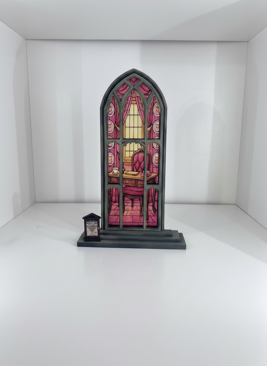 Vidriera decorativa inspirada en un despacho mágico de estilo rosado, lleno de detalles encantados y un pequeño decreto a un lado.