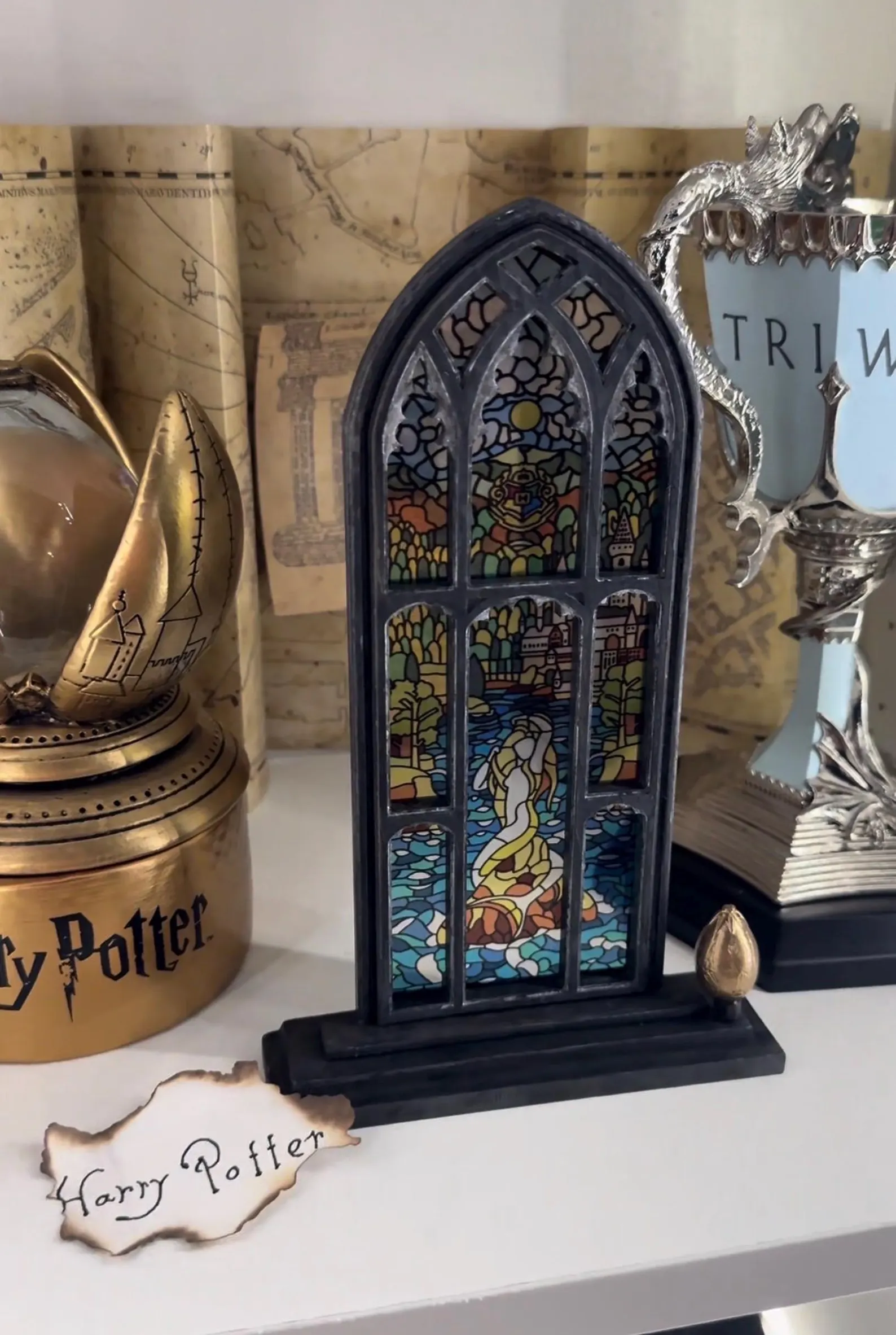 La vidriera de sirena muestra una figura mágica que parece cobrar vida entre reflejos de agua y luz, mientras un huevo dorado descansa cerca, irradiando un brillo cálido y envolvente.