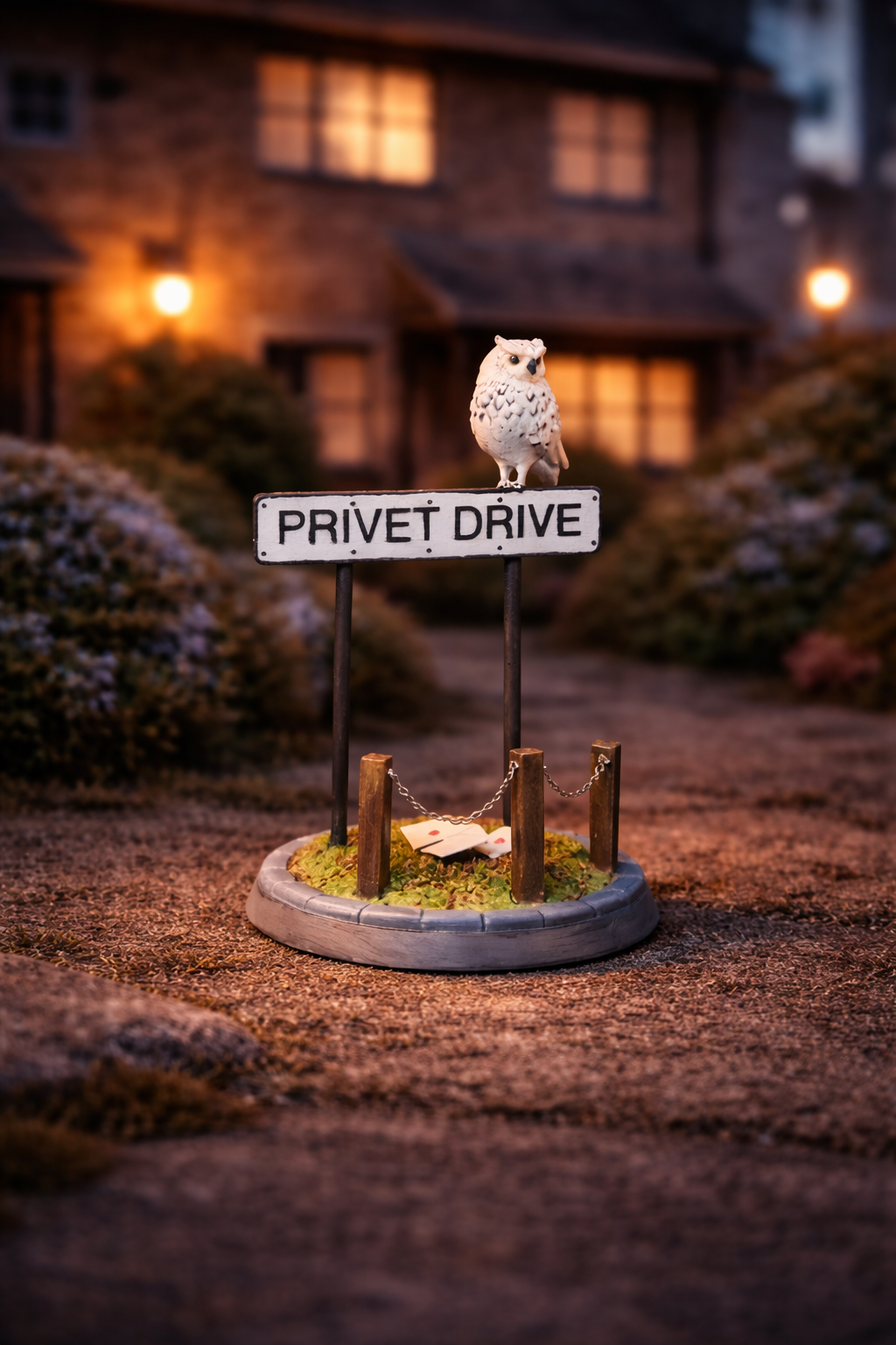 Sobre el letrero descansa una lechuza blanca, símbolo de los mensajes que conectan ambos mundos. En la base, varias cartas selladas se acumulan sobre el césped, evocando la llegada constante de notificaciones inesperadas.