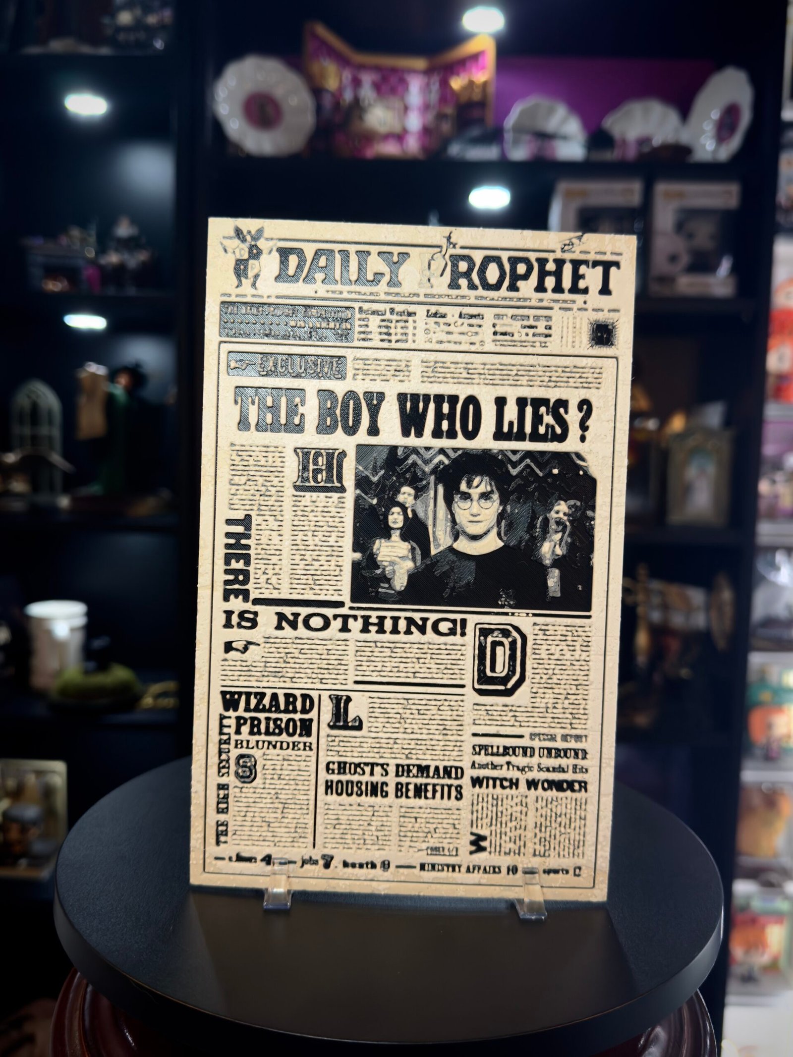 La pieza está realizada en PLA mediante impresión en capas, generando un relieve real que aporta textura y profundidad a cada detalle: titulares, marcos, tipografías e ilustración central. El acabado en tonos monocromáticos refuerza el estilo clásico de prensa antigua y le da un aire auténtico y coleccionable.