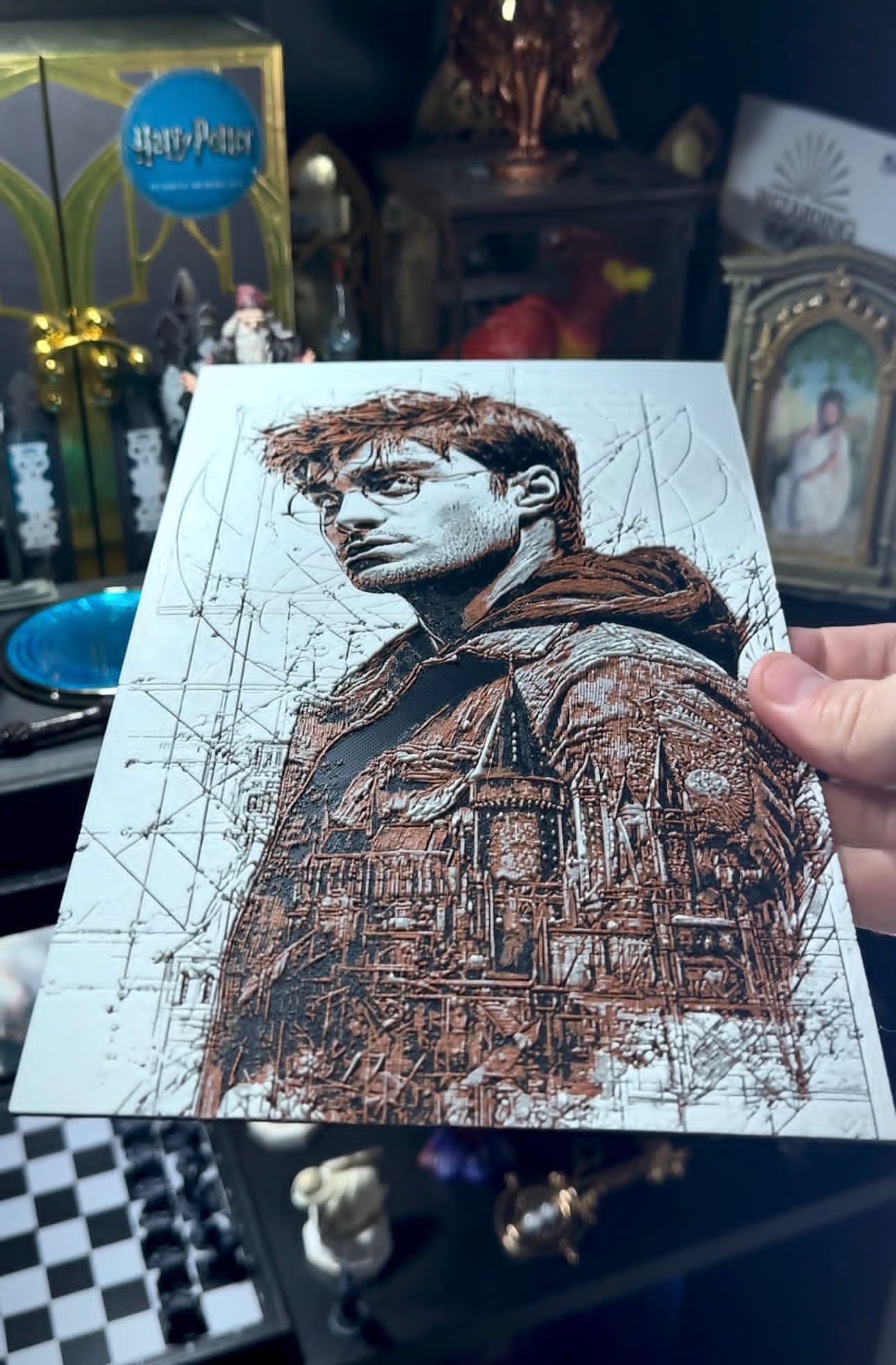 Esta pieza presenta un panel decorativo de gran impacto visual, donde se representa a un joven mago en actitud reflexiva, fusionado con la arquitectura de un castillo mágico que se entrelaza con su figura.